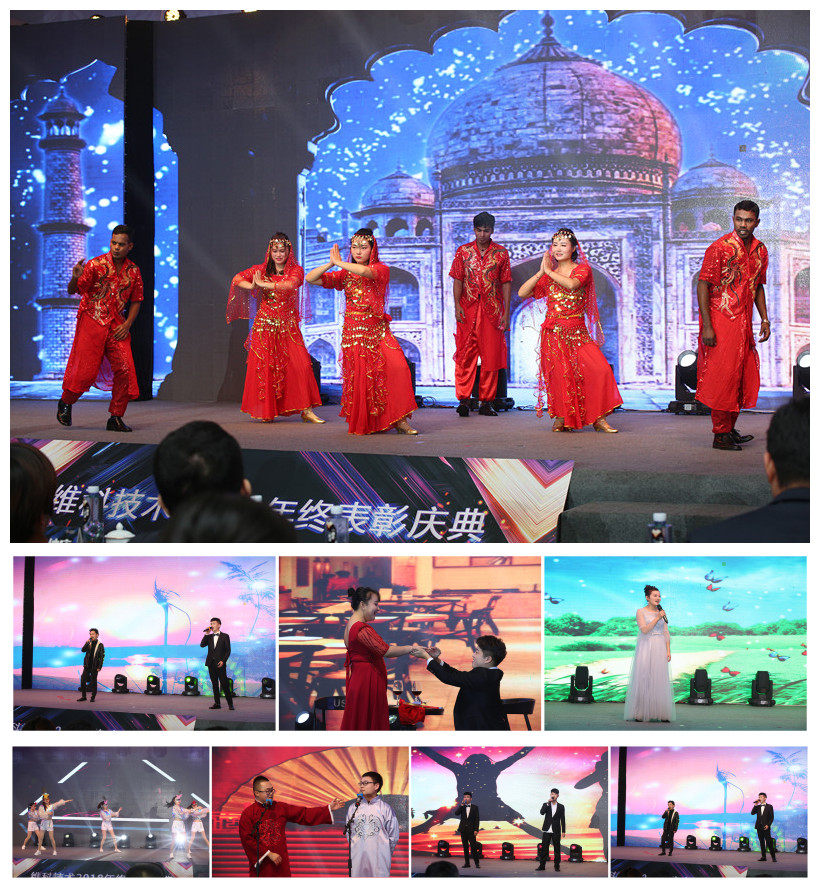 年會中活躍的氣氛、創(chuàng)意的節(jié)目、精美的獎品使得慶典在表彰的同時不失趣味。獨(dú)唱、舞蹈、串燒、合唱、相聲、魔術(shù)應(yīng)有盡有,印象尤為深刻的有舞蹈《Chinese & Indian illusions 》,聯(lián)誼印度員工,一起跳起神秘國度的舞蹈,獻(xiàn)舞2018年維科技術(shù)印度市場的突破,同時也表達(dá)了公司對前往達(dá)曼工作,為公司開拓印度市場沖鋒陷陣,披荊斬棘員工們的關(guān)心和關(guān)注。與此同時,我們也收到了在異國他鄉(xiāng)的維科員工的新年祝福。