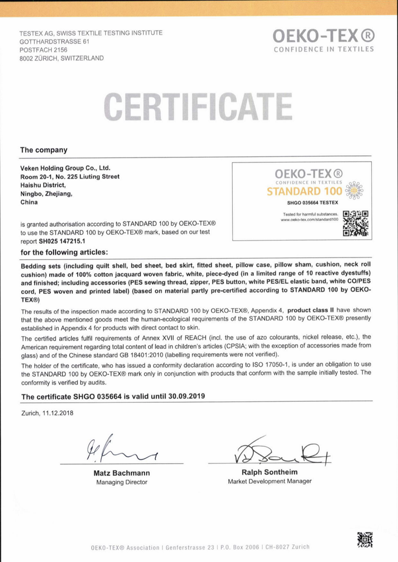 2018年12月11日、維科集団はTESTEXスイス紡績検定有限會(huì)社からSTANDARD 100 by OEKO-TEX認(rèn)証証明書を受け取り、証明書番號(hào)はSHGO 035664、証明書有効期間は1年である。